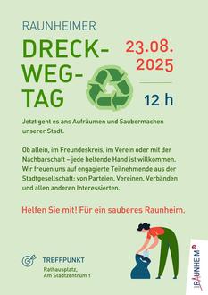Die Stadt Raunheim lädt alle Bürgerinnen und Bürger herzlich dazu ein, sich am diesjährigen Dreck-Weg-Tag zu beteiligen. Ob als Einzelperson, im Freundeskreis, mit dem Verein oder der Nachbarschaft – jede helfende Hand ist willkommen. Wir freuen uns über die Teilnahme von Bürgerinnen und Bürgern, Parteien, Vereinen, Verbänden und Interessierten.