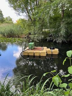 Das Belüftungsgerät, ein sogenannter „Nano-Bubbler“, wurde in den USA produziert und sorgt dort für die Belüftung zahlloser Wasserflächen. Mitarbeitende des Fachdienstes Infrastruktur haben den „Nano-Bubbler“ auf einen Schwimmponton gestellt und versorgen ihn mit Strom aus einer zum Teichsystem gehörenden Zähleranschlusssäule.