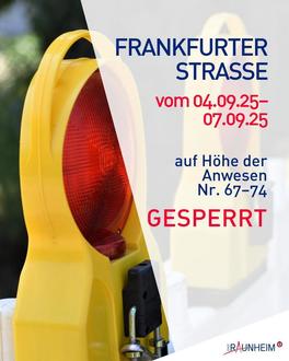 Die Frankfurter Straße ist im Bereich der Hausnummern 67 - 74 wegen der Verlegung einer Wasserleitung vom 4. bis 27. September 2025 voll gesperrt.