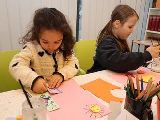 Die Kinder durften Sonnen und Dinosaurier gestalten. Mit Bastelpappe und bunten Filzstiften entstanden farbenprächtige Motive. „Wir setzen hier keine Grenzen“, meinte Remané. Für den dreidimensionalen Effekt hatte sich die Mediatheksleiterin einen Trick einfallen lassen: Sie hatte selbstklebende Abstandhalter mitgebracht, um Bildelemente hervorzuheben.