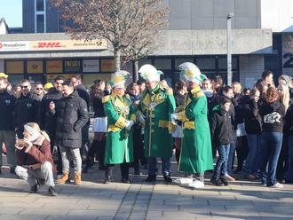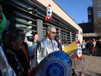 Aus dem Weltall war die Verwaltung mit Bürgermeister David Rendel an der Spitze auf den Rathausplatz gekommen. In silbernen Glitzeranzügen traten sie gemäß dem Motto „Raunheim im Weltall“ der Narrenschaft aus Carneval Club Raunheim, Prinzess-Margret-Garde und Flörsheimer Narren Club entgegen. Die Freunde vom gegenüberliegenden Mainufer unterstützen den Ansturm traditionell mit ihren Kanonen.