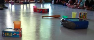 Zur Tauschbörse bringt jede Gruppe das Spielmaterial mit, das sie bei der vorangegangenen Tauschbörse entliehen hat, sowie drei Spielsachen, die sie zum Ausleihen anbieten möchte. Nachdem alle Kinder im Turnraum Platz genommen haben, werden sie von Kita-Leitung Heike Trautwein zu dieser Veranstaltung willkommen geheißen. Zunächst werden die entliehenen Gegenstände den jeweiligen Gruppen zurückgegeben. Nun wird es spannend! Fünf Becher in den Farben der Gruppen werden in der Mitte des Raums aufgestellt: orange, rot, gelb, grün, blau. Trautwein kommt in die Mitte und dreht einen Kegel. Die Gruppe, auf die die Kegelspitze zeigt, freut sich natürlich, denn sie darf beginnen. Zwei Kinder der Gruppe begeben sich in die Raummitte, halten das Spielzeug hoch, damit es von allen gesehen wird, und beschreiben das Spielzeug. Schließlich legen sie den Gegenstand vor den Becher, der in ihrer Gruppenfarbe schimmert. Im Uhrzeigersinn stellen alle Gruppen ihr ausgewähltes Spielzeug vor.