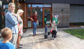 Dann konnte es endlich losgehen. Die begeisterten Kinder und auch die Mütter, die sie begleiteten, zogen ihre Pusteringe durch die Seifenlauge und schwangen sie dann durch die Luft. Viele riesige Seifenblasen entstanden zur Freude der Forschergruppe. Die Kinder und Erwachsenen überboten sich gegenseitig mit den regenbogenfarbenen Seifenblasen.