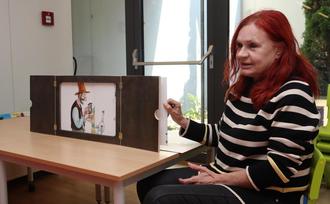 „Jetzt schaut mal, da ist der Herr Pettersson und der sitzt da mit dem kleinen Findus und löst Kreuzworträtsel“, erzählt Birgit Schick von der Mediathek. Sie blickt auf ein kleines Kino mit einer Bildkarte im DIN-A3-Format. Die Mädchen und Jungen schauen sich das erste Bild der Geschichte „Pettersson und Findus – wie Findus zu Pettersson kam“ mit großen Augen an.