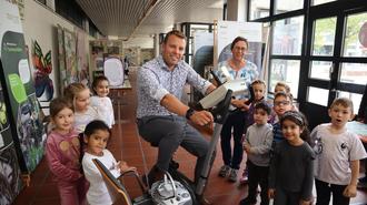 Dies gelang auch Bürgermeister David Rendel, der es sich nicht nehmen ließ, bei seinem Besuch in die Pedale zu treten, bis Töne aus den Lautsprechern erklangen und die Lampe Licht warf.