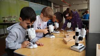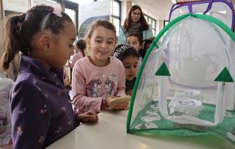 „Wir haben lebendige Tiere hier“, machte Jechimer neugierig auf die spannende Ausstellung. Schmetterlinge flatterten in einem Insektenkäfig mit Netz herum, Schnecken und Raupen waren in transparenten Kästen zu sehen. Bei den Mikroskopen lagen Präparate wie Hirschkäfer, Bienen, Schneckenhäuser, Steine und Eicheln, die unter dem Okular ihre Details zeigten.