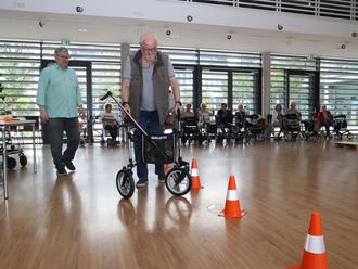 Praktisch üben durften die Seniorinnen und Senioren mit ihrer Gehhilfe an einem Parcours. „Es geht nicht um die Stoppuhr, sondern um die Sicherheit“, so Meyers Hinweis, die Übung in den Vordergrund zu stellen. Slalom, Reliefgummimatte, Bodenschwelle, Rasen, Hula-Hoop-Reifen sowie simulierte Bordsteinkante und Aufzug waren die Herausforderungen. Das klappte mitunter ganz gut. Es wurde gleichwohl ebenfalls deutlich, wie schwierig der Umgang mit dem Rollator doch sein kann.