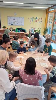 Die Resonanz war immens: Das Foyer der Betreuungseinrichtung war gut gefüllt mit Erwachsenen und deren überwiegend drei- bis sechsjährigen Mädchen und Jungen. Etliche Familien aus der Kita Schwalbennest fanden sich zum Gruppenpizzabacken ein und ebenfalls Familien aus den anderen städtischen Kindertagesstätten hatten den Weg zu der Veranstaltung des Familienzentrums gefunden.