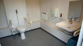 Das Unisex-WC ist ebenerdig zugänglich und behindertengerecht eingerichtet. Außerdem ist es mit einem Wickeltisch ausgestattet. Beides wird durch ein Piktogramm an der Tür deutlich gemacht. In der Toilette kann bei Bedarf ein Notruf mit einem Alarmton und einem roten Warnlicht ausgelöst werden, die von außen gut sicht- und hörbar sind.