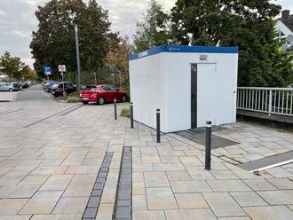 Die provisorische öffentliche Toilette am Bahnhof steht und kann ab sofort genutzt werden. Reisende und andere am Bahnhof verkehrende Passanten können sich also nun dort erleichtern.