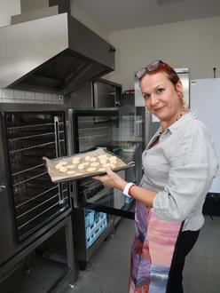 Natalja Petritski schiebt die fertigen Teigkugeln in den Backofen.