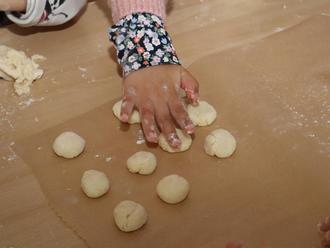 Die Zutaten sind Eigelb, Zucker, Vanillezucker, Quark, Milch, Sonnenblumenöl, Backpulver und Mehl sowie für die Glasur Eiweiß und Puderzucker. Eine große Teigkugel hatte Petritski bereits vorbereitet. Der Teig muss nämlich ein wenig atmen. Also kneteten Kinder und Erwachsene eine weitere Kugel und ließen diese erstmal liegen. Währenddessen konnten sie aus dem vorbereiteten Ballen schon mal viele kleine Lebkuchenkügelchen formen. Während diese im Ofen buken, wurde der zweite Teigballen verarbeitet. Das bereitete besonders den Kindern viel Freude.