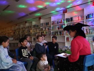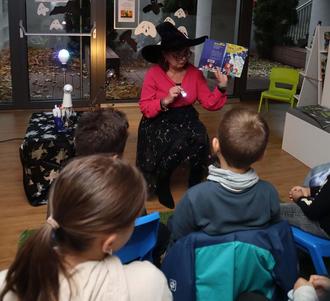 Der Leseraum im Souterrain der Mediathek hatte sich am Montag, den 27. Oktober in eine gruselige Bücherhalle verwandelt. Fledermäuse und Geister hingen an den Wänden und an den Fenstern. Eine Hexe wartete bereits auf die Kinder, die zu ihrer Lesestunde kommen wollten. Denn in einigen Tagen würde Halloween gefeiert werden und Beate Remané – die Leitung der Mediathek – wollte ihnen mit großem Hexenhut auf dem Kopf die gruselige Gespenstergeschichte „Hexe Lilli und der verflixte Gespensterzauber“ vorlesen.