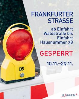 In der Zeit vom 10.11.2025 - 29.11.2025 ist ein Teil der Frankfurter Straße vollgesperrt. Das betrifft den Streckenabschnitt ab der Waldstraße bis zur Einfahrt der Frankfurter Straße 38. Die Einfahrt zur Frankfurter Straße 38 inklusive der Hausnummer und 38a bis 38c sollte voraussichtlich aber befahrbar sein.