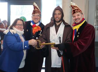 Bürgermeister David Rendel überreichte dem CCR-Co-Vorsitzenden Frank Walloschek, dem CCR-Sitzungspräsidenten Björn Tietje und der PMG-Vorsitzenden Petra Kapp den symbolischen Schlüssel und später bei der Sitzung des Närrischen Rates je ein Köfferchen mit Münzen.