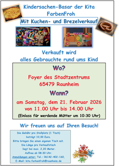 Für Samstag, 21. Februar, laden Team und Elternbeirat der Kita FarbenFroh Familien aus Raunheim und Umgebung von 11:00 bis 14:00 Uhr wie schon seit mehreren Jahren zu ihrem Kindersachenbasar ein. Die Verkaufsfläche befindet sich im Foyer des Stadtzentrums neben der Kita FarbenFroh (gegenüber dem Rathaus). Werdende Mütter haben bereits ab 10:30 Uhr Zutritt zu den Räumlichkeiten.