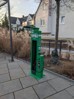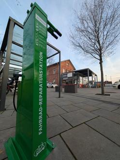 Auf dem Bahnhofsvorplatz, schräg gegenüber dem Bahnhofsgebäude und direkt neben den Fahrradstellplätzen, gibt es ab sofort eine öffentliche Fahrrad-Reparaturstation.
