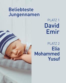 Die meisten 2025 neugeborenen Mädchen heißen Evin, jeweils zwei heißen Amira, Fatima, Sarah und Zeynep. Bei den männlichen Babys landen die Namen David und Emir auf Platz 1, gefolgt von Elia, Mohammed und Yusuf.