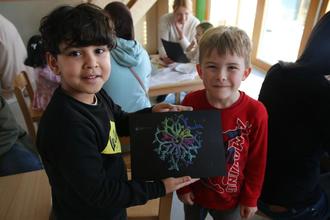 Die Kinder rührten den hellgrauen Papierteig an, aus dem sie später die einzelnen Blätter schöpften. Auf dem getrockneten Papier ließen sie mit Lebensmittelfarben kleine Kunstwerke entstehen.