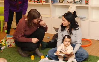Mona Krätschmer (links) war mit einer Präsentation über Bilderbuchbetrachtungen für Kinder im U3-Alter im Familienzentrum zu Besuch.