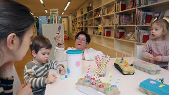 Für das Halbjahresprogramm des Familienzentrum hatte Lauriolle-Müller dieses neue Angebot entwickelt. Zum U3-Eltern-Kind-Treff in der Mediathek brachte sie Perlen, Strohhalme, Lego-Steine, Schuh- und Eierkartons, Stifte, Wäscheklammern, Schaschlikspieße, Deckel und viele andere Materialien mit, um Anregungen und Tipps für eine eigene selbst gebastelte Spielzeugsammlung zu geben. Eltern und Kinder schnitten und malten aus und steckten geschickt bunte Dinge aus- und ineinander. Schnell entstanden viele verschiedene Steckspiele, Rasseln und vieles mehr. „Diese Funktionsspiele sind für jedes Alter geeignet, insbesondere für zwei- bis dreijährige Kinder“, stellt Lauriolle-Müller fest.