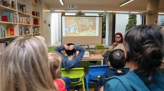 „Wir schauen heute in bisschen Kino“, begrüßte Birgit Schick Kinder und Eltern, die es sich vor einer großen Leinwand im Souterrain der Mediathek gemütlich gemacht hatten. Ein niedliches Schwein, ein fröhlicher Hahn und eine kleine Maus sind bereits auf der Leinwand zu sehen. „Wart ihr denn schon mal in einem großen Kino?“, fragte die Mitarbeiterin der Mediathek die Kinder.