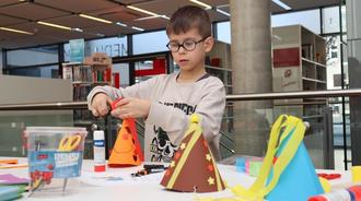 Das sah nach einem kreativen Projekt aus: Tonpapier, Bommeln, Sterne, Hutband, bunte Markierungspunkte, Klebestifte und Schnittvorlagen lagen auf den Tischen in der Mediathek. Dort war das Faschingsbasteln mit Mitarbeiter Christian Nold angesagt.