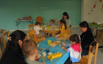 An diesem Vormittag stellten die Mütter und ihre Kinder Vasen und bunte Blumensträuße her. Zuerst wurden Gläser mit Pinseln farbig angestrichen und zum Trocknen ans Fenster gestellt. Für die Blumen wurden Blüten aus Eierkarton zurechtgeschnitten, mit Buntstiften bemalt, auf Holzstäbe gesteckt und mit etwas Knete und Klebestoff befestigt. Schließlich wurde das Innere der Blüte mit einem Knopf verziert, der ebenfalls mit etwas Knete befestigt wurde. Während die Kinder eifrig mit Pinseln und Buntstiften malten und dabei sehr selbstsicher die Farben auswählten, halfen die Mütter beim Ausschneiden und Zusammenfügen der Teile. So entstanden wunderschöne Kunstwerke, die die Kinder stolz mit nach Hause nahmen. Wie immer hatten die anwesenden Mütter Kuchen und andere Köstlichkeiten mitgebracht, die nach getaner Arbeit bei Kaffee und Tee und anregenden Gesprächen verspeist wurden.