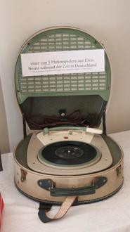 Was gab’s zu bestaunen? Zunächst mal einige Originale vom King. Wie die Uniform, die er bei einer Pressekonferenz am 1. März 1960 in Friedberg trug, eine Felduniform, einen Schal aus einer Pressekonferenz aus dem Jahr 1969, ein Hemd von der Tour 1970 und einen Plattenspieler aus seinem Besitz während seiner Zeit in Deutschland.