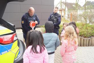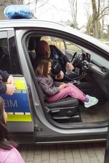 Besonders begeistert waren die Kinder, als der Streifenwagen vorgeführt wurde. Sie durften sich in den Streifenwagen setzen, über das Außenmikrofon ein „Hallo“ an die Kinder außerhalb des Autos rufen und sogar Blaulicht sowie Martinshorn einschalten.