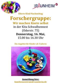 Die Eltern-Kind-Forschergruppe trifft sich am Donnerstag, 16. Mai, von 15.00 bis 16.30 Uhr in der Kita Schwalbennest, Oderstraße 75: Das Familienzentrum lädt für diesen Nachmittag zum gemeinsamen Herstellen von Knete ein.