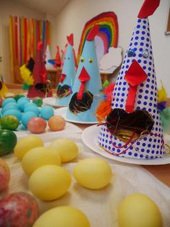 Als Hühner in Kegelform thronten die farbenprächtigen Osterkörbchen in der Kita Drachenland und waren in diesem Jahr echte Hingucker. Durch die herzförmige Öffnung im Hühnerkörper legten die Kinder die Ostereier in den Hühnerbauch, der mit farbigem Bastelstroh ausgepolstert war. Die gut befüllten Körbchen durften die stolzen „Schukis“ selbstverständlich später mit nach Hause nehmen.