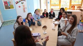 „Sie ist ein Naturtalent, was das Schminken betrifft“, stellte Irini Kaldi, die Leiterin der Kita, anerkennend fest. Weil sie noch eine sehr junge Kollegin ist, war der Altersunterschied zu den Teilnehmerinnen nicht so hoch und somit die Hemmschwelle der Kinder und Jugendlichen sehr gering, im Austausch während des Workshops Fragen zu stellen und von ihrem Wissen zu profitieren.
