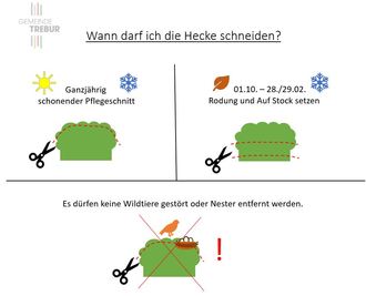 Ganzjährig sind schonende Form- und Pflegeschnitte von Hecken erlaubt. Damit ist z. B. die Wegnahme des jährlichen Zuwachses gemeint. Dabei ist zu beachten, dass keine Vögel oder andere Wildtiere durch den Schnitt gestört oder Nester entfernt werden.