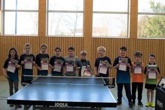 Hier die einzelnen Ergebnisse nach Altersklassen (gemeinsame Gruppenspiele jeweils bei den Mädchen und Jungen, Modus jeder-gegen-jeden); alle Platzierten sind für den weiterführenden Bezirksentscheid am Sa. 29.04.23 beim TTC Langen qualifiziert:
