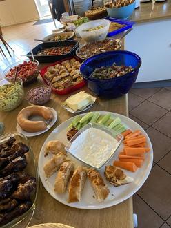 Um die Mittagszeit gab es eine gemeinsame Pause und da zeigte der Chor wieder einmal, dass hier nicht nur gut gesungen, sondern auch gut gekocht und gebacken wird. Jeder hatte etwas mitgebracht und das Buffet war mehr als reichhaltig und sehr lecker. Obwohl die Stimmbänder am Vormittag arg strapaziert wurden, wurde in der Mittagspause viel erzählt und gelacht, wie immer, wenn der Chor zusammen ist. Da fiel der Wiedereinstieg nach der Mittagspause wirklich schwer ...