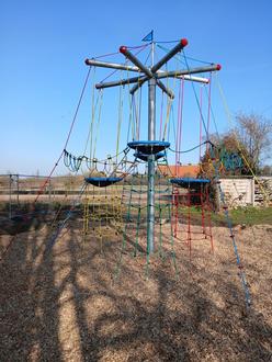 Die Neugestaltung des Spielplatzes Hessenaue am Dorfgemeinschaftshaus schreitet voran. Ab sofort ist der Vogelnestbaum zum Spielen frei gegeben. An Leitern, Netzen, Tauen und Seilen kann man bis auf fast 6 Meter Höhe klettern und den Blick über das gesamte Dorf genießen.