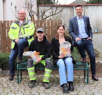 Leiter des Technischen Betriebshofs Udo Seemann, Nils Fischer, Jule Nowak und Bürgermeister Jochen Engel)