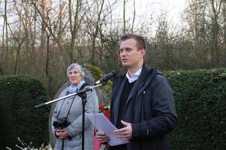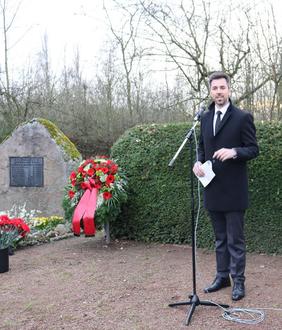 Hendrik Drechsler, Haus des Erinnerns Mainz, Referent für Bildung und Gedenkstättenfahrten, übernahm die Ansprache von Dr. Cornelia Dold, Historikerin und Leiterin des Hauses des Erinnerns - für Demokratie und Akzeptanz, die aus privaten Gründen die Einladung nicht wahrnehmen konnte.