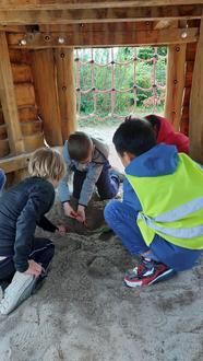 Mit Feuereifer waren die Kinder am nächsten Tag mit der „Schatzsuche“ beschäftigt. Auf dem Weg zum Spielplatz „Am Mittelpfad“ mussten verschiedene Fragen beantwortet werden um dann unter dem großen Spielplatzschiff den eingegrabenen Schatz zu bergen.
