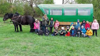 Ein weiterer Höhepunkt war die Planwagenfahrt am letzten Tag. Leider war es etwas stürmisch und recht frisch und es zeigte sich einmal wieder, dass es kein schlechtes Wetter, sondern nur schlechte Kleidung gibt. Die Kaltblüter Mausi und Anna zogen kraftvoll den Planwagen zum Lärchenloch. In dieser schönen Umgebung hatte Herr Klöß vom Rheinhäuserhof sogar ein paar Spiele dabei, die den Kindern großen Spaß machten. Beim Sackhüpfen, Hufeisen werfen und Riesenseilspringen wurde es den Kindern wieder warm.
