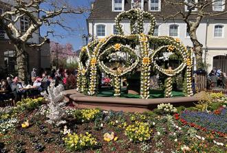 Erster Akzent des Osterdorfes war die mit 2500 handbemalten Eiern filigran geschmückte, überdimensionale prächtige Osterkrone auf dem Brunnen des Schlossplatzes. Das von einem blühenden Frühlingsbeet umrahmte Kunstwerk war ein wahrer Augenschmaus.