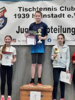 Am selben Tag schnürten auch Amélie Ducci und Laura Calvente Casás in einer anderen Sporthalle ihre Hallenschuhe. Nach ihrem erfolgreichen Abschneiden als Erste und Zweite bei den Kreisjahrgangsmeisterschaften in Crumstadt standen sie am Samstagnachmittag bei den Bezirksjahrgangsmeisterschaften in der Frankfurter Riedhalle an den Tischen. Ein allgemein und auch bei den Mädchen großes Teilnehmerfeld erfreute einerseits den Veranstalter, sorgte allerdings auch für einen langestreckten Turnierablauf. Auch in Frankfurt spielten die 14 Mädels des Jahrgangs 2012 zunächst in Gruppen. Mit drei Siegen sicherte sich Laura in ihrer Vierergruppe den Gruppensieg und zog ins Viertelfinale ein. Dies blieb Amélie leider verwehrt, da sie mit einem Sieg und zwei Niederlagen knapp als Dritte in der Gruppe ausschied. Mit einem sicheren Dreisatzerfolg zog Laura dann sogar ins Halbfinale ein, wo sie dann allerdings gegen die spätere Siegerin in drei Sätzen unterlag. Nach einem langen Turniertag durfte sie sich dann bei der Siegerehrung am späten Abend über den Pokal für ihren 3. Platz freuen.