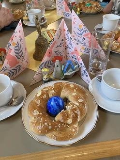 Nach soviel interessanten österlichen Informationen wurde natürlich Kaffee und ein leckeres Butterteignest, eigens von Gerd Abels für die LandFrauen kreiert, mit buntem Osterei und Schoko-Häschen serviert.