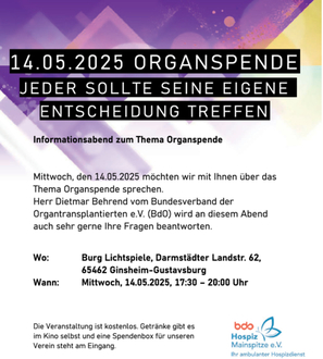 Mittwoch, den 14.05.2025 möchten wir mit Ihnen über das Thema Organspende sprechen.