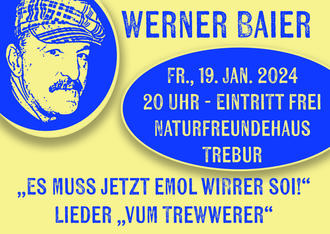 Mit dem Motto des Abends „es muss jetzt emol wirrer soi!“ stellt Baier auch klar, dass es höchste Zeit für echte Begegnungen und Pflege des heimischen Dialekts ist. Zu hören gibt es an diesem Abend Lieder und Geschichten aus Trebur. Nach eigener Aussage hat Werner Baier seine Lieder den Menschen „vom Mund geklaut“, wie Titel wie „Die Kapp vum Disch“ und „Bohnesupp“ vermuten lassen. Aber auch Lieder wie „Lercheloch“ und „Wenn Du in Trewwer geboren bist“ versprechen reichlich Lokalkolorit.