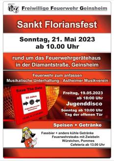 Anlässlich des 50-jährigen Bestehens unserer Jugendfeuerwehr findet am Freitag, 19. Mai ab 18 Uhr eine Jugenddisco und am Sonntag, 21. Mai ab 10 Uhr das Sankt Floriansfest im und rund ums Feuerwehrhaus in der Diamantstraße statt. Wir würden uns freuen, bei beiden Veranstaltungen recht viele Gäste begrüßen zu können.