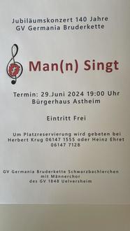 Konzert des GV Germania Bruderkette unter dem Motto: Man(n) singt Unter diesem Motto veranstaltet der GV Germania Bruderkette Astheim sein Jubiläumskonzert im Bürgerhaus am 29.6.2024 um 19 Uhr. Dieses Jahr feiert der Gesangverein sein 140jähriges Bestehen und das wollen wir mit einem Konzert feiern, nähere Einzelheiten teilen wir an dieser Stelle noch mit, freuen Sie sich aber bereits jetzt, tragen den Termin in ihrem Kalender ein. Damit wir planen können ist es für uns erforderlich dass wir wissen wie viele Gäste wir erwarten können. Obwohl der Eintritt frei ist bittem wir um eine telefonische Anmeldung entweder bei Heinz Ehret Tel 061477128 oder Herbert Krug Tel. 061471555.