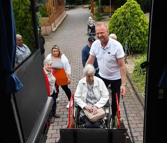 Nicht mal der Einstieg in den Bus fiel schwer, weil sie mit einer Hebebühne samt Rollstuhl in den Fahrgastraum gehievt werden konnten (wenn sie nicht selbst zu Fuß einsteigen konnten). Der freundliche Busfahrer steuerte die Anlage behutsam.