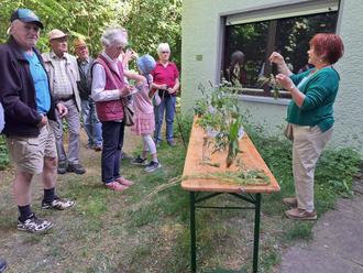 Wilder Majoran, Wilderbeerblätter, Bärlauch oder Brennessel: Wer glaubt, dass es solche exotisch anmutenden Kräuter nur selten oder bei ausgesuchten Züchtern gibt, der hat sich arg getäuscht. Tatsächlich bietet die heimische Natur alles davon. Den Beweis traten Gesine Wechterstein und Eva Sellner im Rahmen der Botanischen Wanderung des Nabu Astheim an. Dabei führte der Weg der gut 20 Teilnehmerinnen und Teilnehmer gar nicht in exotische Ferne: Rund um das Margareta-Schenkel-Haus in Astheim bietet die Natur Überfluss pur. Mit eigenen Sinnen und der ein oder anderen Geschmacksprobe erfuhren die Teilnehmer allerlei Wissenswertes über das, was die Natur für uns bereithält: Heilkräuter, deren Wirkung schon die Vorfahren kannten, würzende Pflanzen, die den Speiseplan bereichern und überhaupt, „Unkräuter“, die in Wirklichkeit die Artenvielfalt bereichen: die Schatzkiste von Mutter Natur ist reichhaltig! Einige Impressionen.